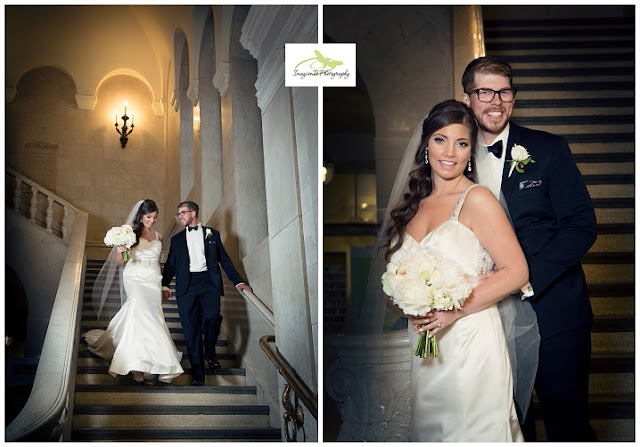The Cleveland Marriott Downtown at Key Center is always a beautiful location for a wedding, especially this couple! Tracy and Drew met seven years ago at The Ohio State University. They are big fans and it showed in some of the details of the wedding. Be sure to check out Drew's Buckeye boutonniere! Tracy and Drew's wedding and reception were both held here, which always makes the day seamless for the guest! With preparations right in the hotel, they did an emotional 'first look' with Cleveland's Fountain of Eternal Life in the background. For their formal portraits, they braved the strong winds and ventured into Cleveland for different backgrounds. A bit of traffic and cold winds did not detour this fun and crazy wedding party! They were happy to share in the day with their great friends and family!